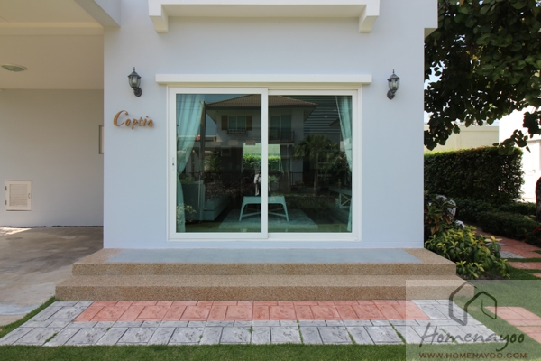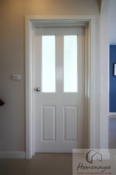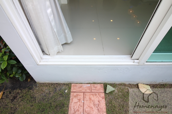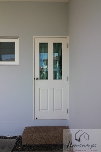 ประตูทางเข้าบ้านจะเป็นประตูบานเลื่อนอลูมิเนียมสีธรรมชาติลูกฟักกระจกเขียวตัดแสงเหมือนกัน