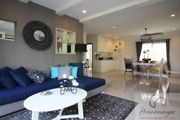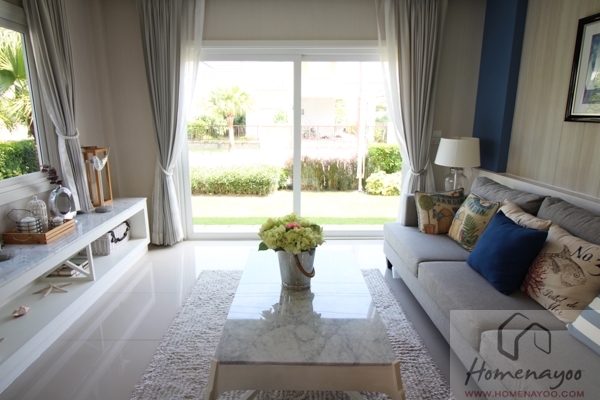 การออกแบบโครงการ และวัสดุ โครงการเป็นบ้านเดี่ยวและบ้านแฝดสไตล์ Santorini ให้อารมณ์เหมือนกับรีสอร์ท สูง 2 ชั้น มีจำนวนทั้งหมด 329 ยูนิตบนพื้นที่ 66 ไร่รูปตัว T บ้านถูกออกแบบมาให้มีพื้นที่ใช้สอยที่กว้างขวางและเป็นพื้นที่ๆมีประสิทธิภาพในการใช้งาน ภายในบ้านมีหน้าต่างบานใหญ่อยู่โดยรอบทำให้ตัวบ้านสว่างด้วยแสงจากธรรมชาติ อากาศภายในบ้านสามารถถ่ายเทได้ดี ทำให้ตัวบ้านเย็นสบายและไม่อับ ส่วนวัสดุและสุขภัณฑ์ที่ใช้ภายในบ้านถือว่าได้มาตรฐานค่ะ