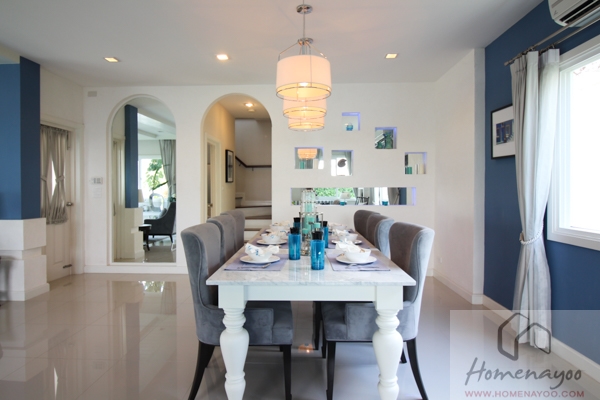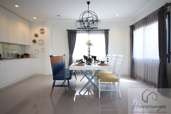 มาดูในส่วนของห้องรับประทานอาหารกัน จะเห็นว่าเมื่อจัดวางโต๊ะทานอาหารขนาด 6 ที่นั่งแล้วก็ยังเหลือพื้นที่ข้างๆอีกเยอะ สามารถทำแพนทรี่ หรือชั้นวางของได้รอบด้าน หรือจะหมุนทิศการวางโต๊ะก็ทำได้เช่นกัน