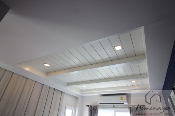 ผนังอีกฝั่งจะสามารถทำชั้น Built – in เพื่อวางทีวีและจัดเก็บของได้ หรือจะทำเป็นชั้นวางทีวีเตี้ยๆแบบบ้านตัวอย่างก็ทำให้ห้องดูโปร่งดี