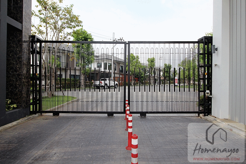 รั้วบ้านเป็นเหล็กโปร่งสีดำแบบบานเลื่อนที่เปิดได้ง่าย