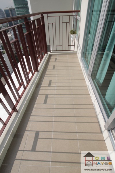 ระเบียงในส่วนของ Living ปูพื้นกระเบื้องขนาด 30×30 ซม. ด้านขวาของระเบียงมีช่องเก็บคอมเพรสเซอร์แอร์ แบบมีระแนงกั้น เหมือนห้องที่แล้วค่ะ