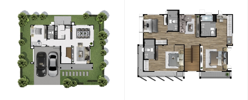 พื้นชั้น 2 เป็นไม้ลามิเนตหนา 8 มม. โถงบันไดชั้น 2 จะแจกเข้าไปสู่ห้องนอน 3 ห้อง พร้อมห้องน้ำในตัวทุกห้อง ขึ้นมาจะเจอพื้นที่อเนกประสงค์ตรงกลางโถงบันได