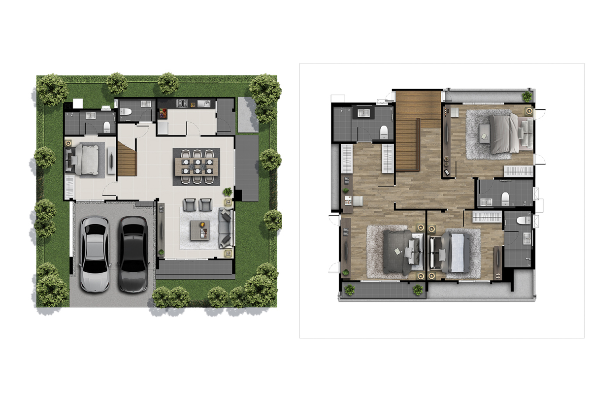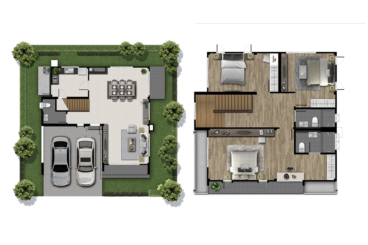 วันนี้เราจะพาชมแบบบ้านไซซ์ใหญ่สุด คือแบบบ้าน Double Bliss พื้นที่ใช้สอย 274 ตร.ม. ที่ดินเริ่มต้น 65.9 ตร.วา