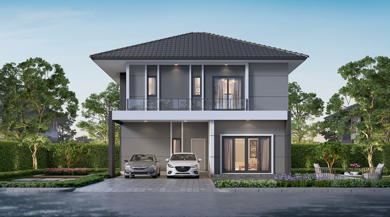 หน้าตาภายนอกเป็นสไตล์ Modern ใช้โทนสีเทาและขาวไล่เฉด โครงสร้างบ้านก่อสร้างด้วยระบบ Conventional โดยใช้อิฐมวลเบา Q-Con ที่เราสามารถทุบเจาะ ต่อเติมเองภายหลังได้