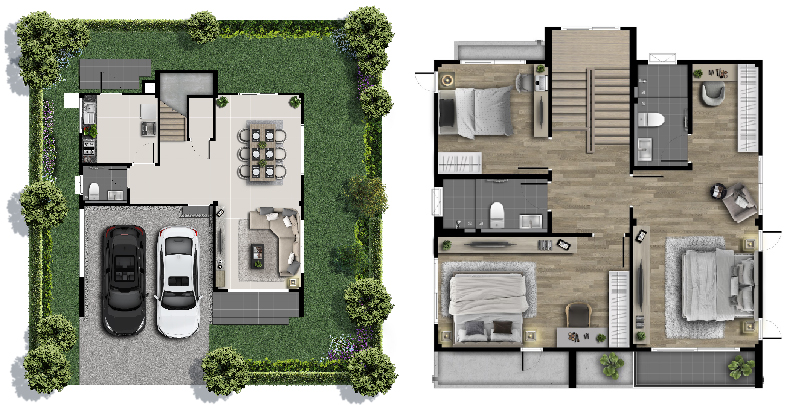 อีกโซนของบ้าน มุมด้านหลังเป็นห้องนอน 2 พื้นที่ในห้องสามารถวางเตียง 5 ฟุตได้ มีพื้นที่เหลือให้วางโต๊ะทำงาน ตู้เสื้อผ้าได้อีก และมีห้องน้ำในห้องนอน ส่วนมุมด้านหน้าเป็นห้องนอน 3 ขนาดห้องใกล้เคียงกัน วางเตียง 5 ฟุต โต๊ะ ตู้เสื้อผ้าได้ครบ และมีห้องน้ำในห้องนอนเช่นกัน