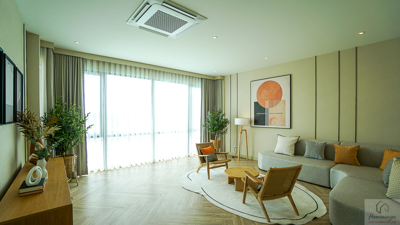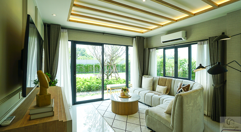 ระยะดูทีวีให้มากว้าง ติดทีวีจอขนาด 65-70 นิ้วได้เลย จะแขวนทีวีผนัง หรือจะทำเป็นตู้ชั้นวางทีวีก็สามารถดีไซน์ได้ตามชอบเลย