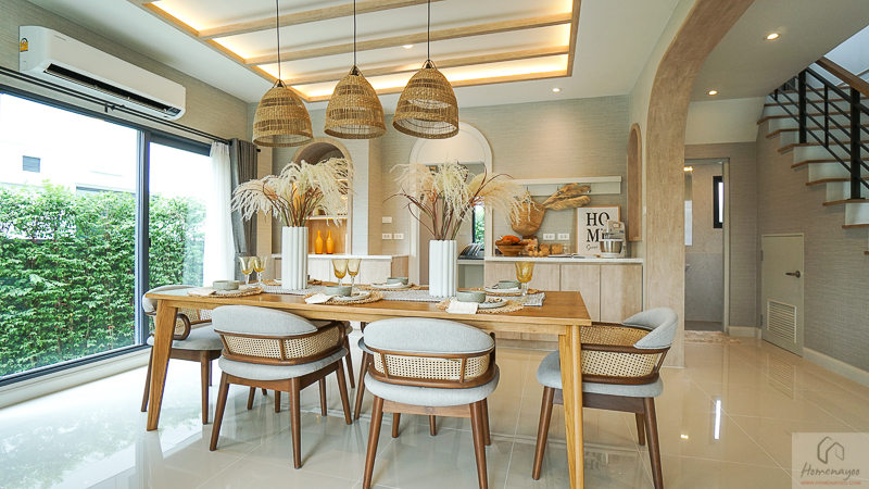 ตรงส่วนรับประทานอาหารให้พื้นที่มากว้างดี จัดวางโต๊ะรับประทานอาหารขนาด 6 ที่นั่งมาให้ดู มีพื้นที่เหลือรอบ ๆ จะวางเป็นแบบโต๊ะกลมก็ได้ครับ
