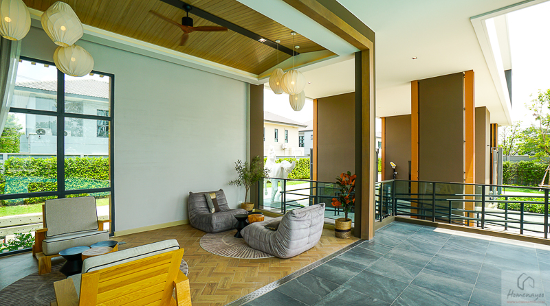 พื้นที่ระเบียงขนาดใหญ่ ยาวเกือบเท่าหน้ากว้างของบ้าน พื้นที่เชื่อมไปตรงส่วนระเบียงห้อง Master Bedroom เลยครับ เราสามารถวางชุดโต๊ะนั่งพักผ่อน หรือจัดสวนวางกระถางต้นไม้ได้ตามต้องการเลย ราวกันตกเป็นกระจกไม่บดบังวิวด้านนอก
