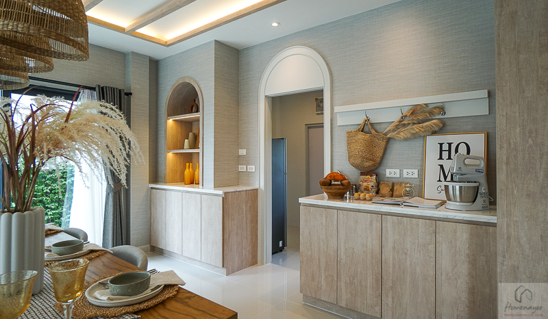 ถัดมาโซนหลังบ้านเป็นห้องครัว หน้าห้องครัวมีพื้นที่ให้ทำเป็นชั้นวางของ ตู้เก็บของ หรือเป็นส่วนเตรียมอาหารก็ได้ ตกแต่งได้ตามต้องการ