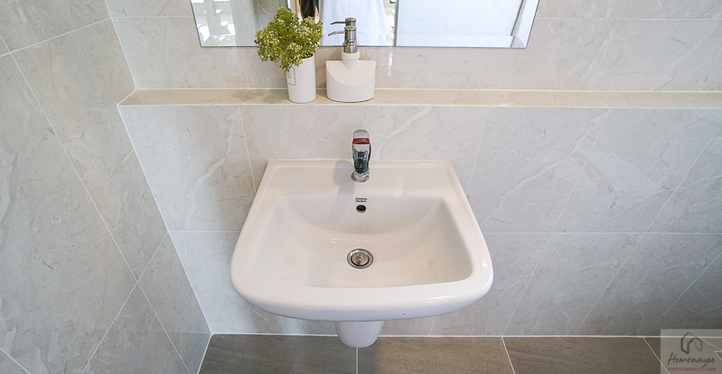 ห้องน้ำชั้นล่างเป็นแบบ Powder Room คือไม่มีพื้นที่ส่วนเปียกนั่นเอง พื้นและผนัง ตกแต่งด้วยกระเบื้องลายหิน มีช่องแสงในห้องน้ำเป็นบานกระทุ้งเปิดระบายอากาศได้