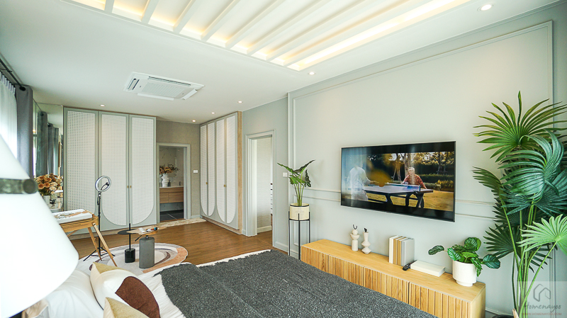 ฝั่งปลายเตียงวางเป็นตู้เก็บของ ชั้นวางทีวีได้ แขวนทีวีที่ผนังเพื่อประหยัดพื้นที่ ระยะดูทีวีให้มากว้างติดทีวีจอขนาด 55-65 นิ้วได้เลย
