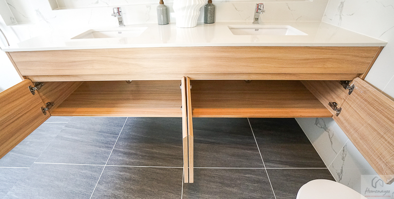ใต้อ่างล้างหน้ามีตู้เก็บของมาให้เป็นแบบบานเปิด 4 บาน ภายในเก็บของได้เยอะดี