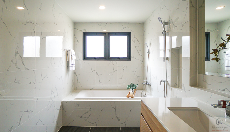 ภายในห้องน้ำแบ่งส่วนเปียกส่วนแห้ง พื้นและผนังตกแต่งด้วยประเบื้องลายหิน สุขภัณฑ์ที่ได้ของ American Standard ในห้องน้ำมีช่องแสงเป็นบานกระทุ้งเปิดระบายอากาศได้