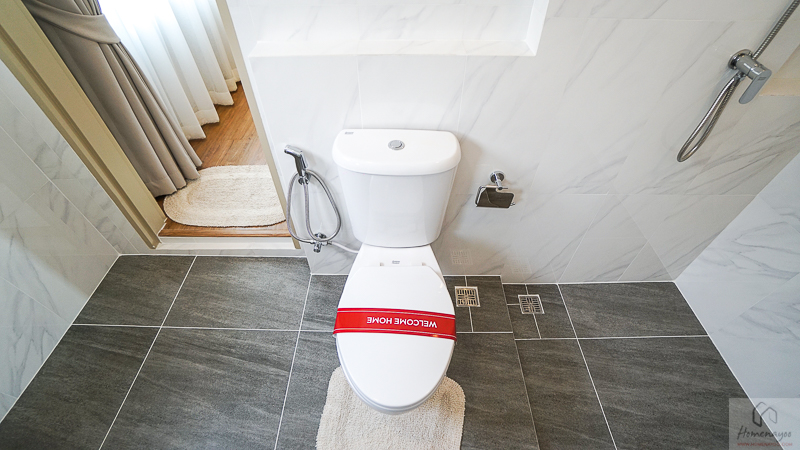 อีกส่วนเป็นพื้นที่ส่วนเปียกติดฉากกั้นอาบน้ำเพิ่มเองได้ ด้านในติดตั้ง Hand Shower ปรับระดับสูงต่ำได้ พพร้อมเดินงานระบบไฟฟ้าติด Junction Box รองรับการติดตั้งเครื่องทำน้ำอุ่นมาให้ และด้านข้างมีช่องไว้สำหรับวางอุปกรณ์อาบน้ำให้อีกด้วย