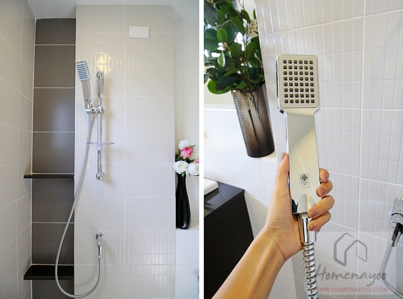 ผนังข้างชุดฝักบัวเตรียมงานระบบเครื่องทำน้ำอุ่นมาให้ พร้อมทำชั้นวางของมาให้เรียบร้อยถึง 2 ชั้น จับฝักบัวให้ดูจะเห็นว่ามีขนาดกำลังพอดีมือ ชุดฝักบัวเป็นของ Prema