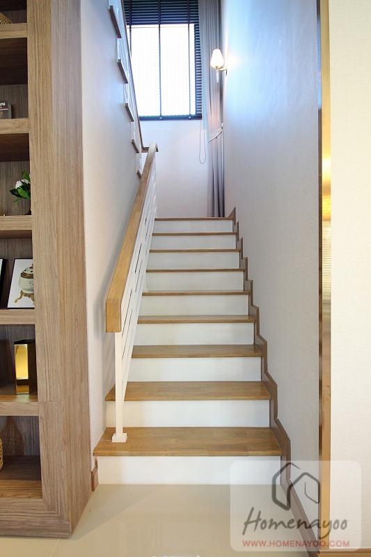 ตัวโถงบันไดบ้านตัวอย่างมีเจาะช่องแสงธรรมชาติมาให้ พร้อมโคมห้อยที่เพดานเพิ่มความสว่างให้โถงบันไดตอนกลางคืน แต่ตอนกลางวันไม่มีปัญหาอะไรเพราะช่องแสงเจาะมากว้างอยู่แล้ว พื้นชั้น 2 เป็นไม้ลามิเนตหนา 8 มม. ส่วนราวกันตกบันไดจะเป็นเหล็กทาสีขาวท้อปเป็นไม้สีเข้ากันกับพื้นบันไดและพื้น