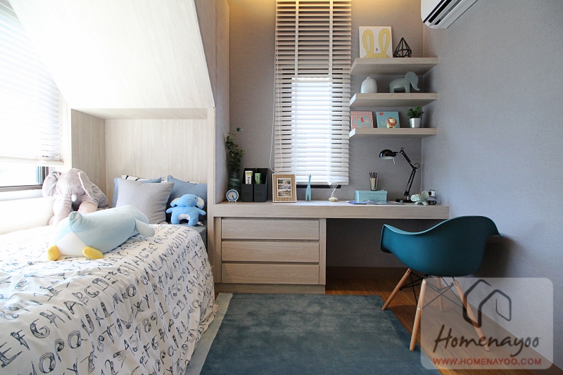 บ้านตัวอย่างจัดเป็นห้องนอนเด็กค่ะ ห้องนอนนี้สามารถวางเตียงคู่ขนาด 5 ฟุตได้นะคะ แต่ห้องตัวอย่างวางเตียงเดี่ยวแบบ Custom มาให้ดูเป็นไอเดีย มีหน้าต่างมาให้ 2 ฝั่ง ข้างเตียงมีระยะพอวางโต๊ะข้างเตียง โต๊ะทำงานและตู้เสื้อผ้าได้