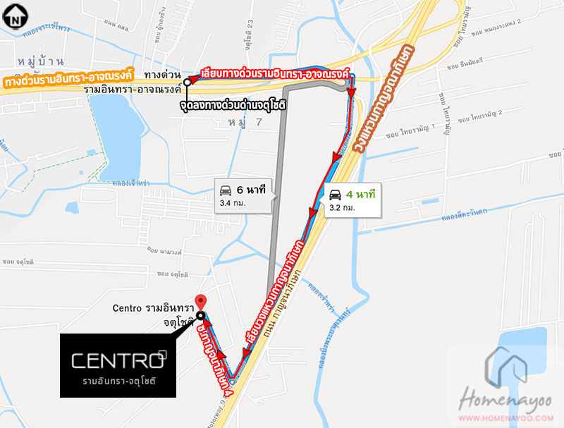 วันนี้เรามีภาพการเดินทางจากรถมาให้ชมกันค่ะ เส้นทางการเดินทางตามลูกศรแดง โดยเริ่มเดินทางจาก ทางด่วนรามอินทรา-อาจณรงค์ ด่านจตุโชติ → เลี้ยวขวาเข้าเลียบวงแหวนกาญจนาภิเษก → เลี้ยวขวาเข้าซอยกาญจนาภิเษก 4 → ตรงไปประมาณ 450 เมตร → จะเจอโครงการ Centro รามอินทรา-จตุโชติ อยู่ทางซ้ายมือแล้วค่ะ ไปดูภาพการเดินทางกันต่อ