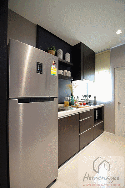 ส่วนครัวในบ้านตัวอย่างจะทำ Built in ชุดครัวพร้อมวางตู้เย็นมาให้ดูระยะใช้งาน แต่ของจริงจะเป็นห้องโล่งๆ และเตรียมงานระบบมาให้นะคะ
