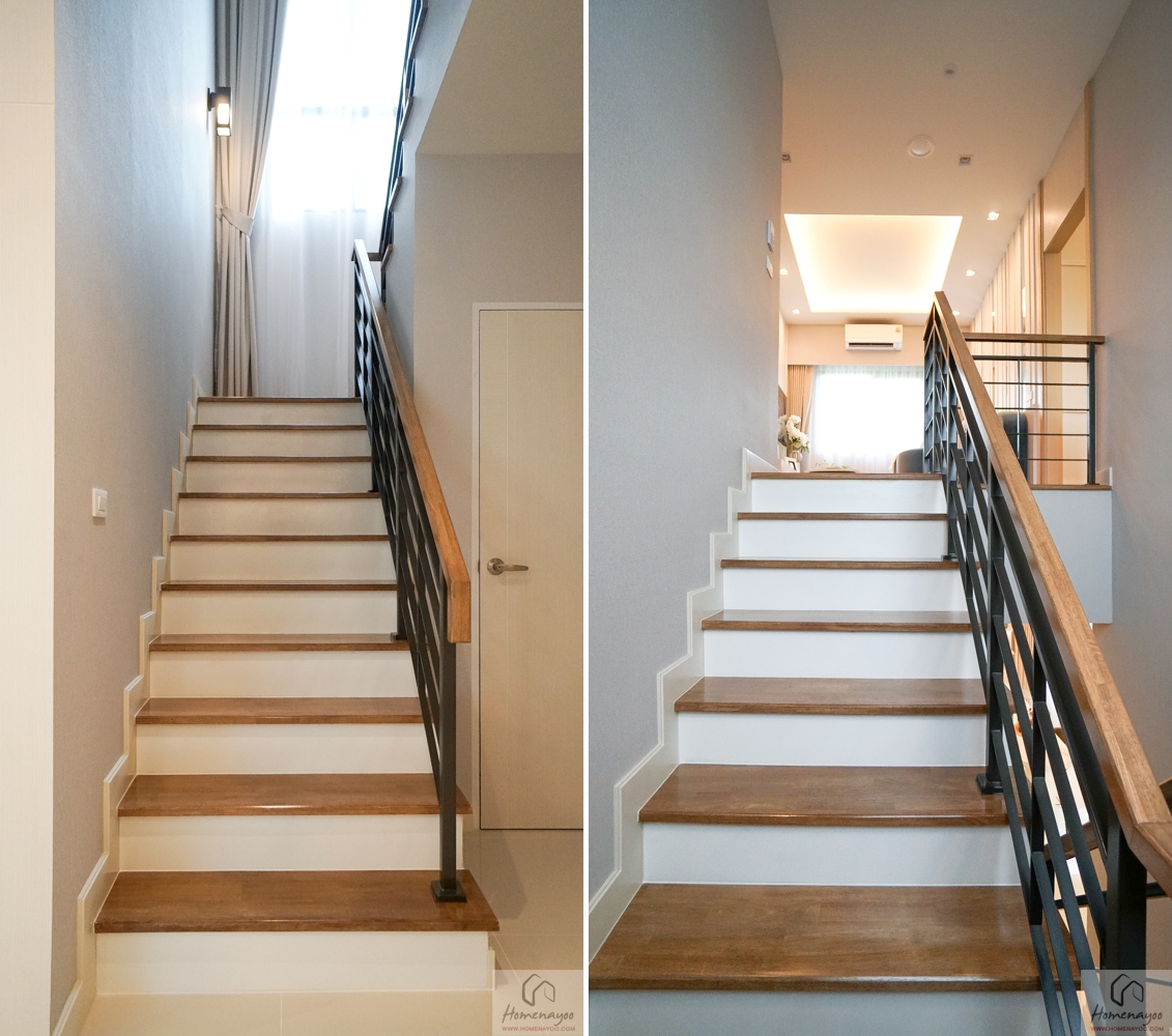 ขึ้นไปดูชั้น 2 กันต่อ / บันไดบ้านได้เป็นโครงสร้างคอนกรีตเสริมเหล็ก ลูกนอนเป็นไม้ยางพาราประสาน ราวบันไดสำเร็จรูปสีเทาดำ มือจับไม้ยางพาราประสานชนิดเดียวกับลูกนอน โดยจะติดยาวต่อเนื่องจากขั้นแรกขึ้นไปจนถึงโถงบ้านชั้น 2 แบบในภาพ