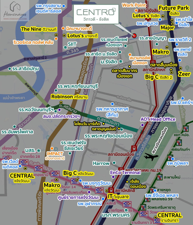 ⇒ ทำเลที่ตั้งโครงการ : CENTRO วิภาวดี-รังสิต เป็นบ้านเดี่ยวโครงการใหม่ของ AP มีจุดเด่นคืออยู่ติดถนนใหญ่ ใกล้ ม.รังสิต และ รร.สาธิต ม.รังสิต เหมาะสำหรับคนที่กำลังมองหาบ้านเดี่ยวใกล้เมือง บนถนน 345 ซึ่งเป็นทำเลยอดนิยมในการอยู่อาศัย และเป็นทำเลที่รวบรวมทุกแหล่งอำนวยความสะดวก ไม่ว่าจะเป็นการเดินทางด้วยรถส่วนตัว, รถเมล์, รถไฟฟ้า
