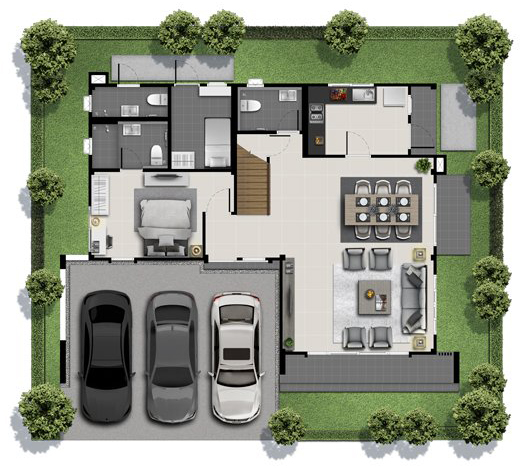 แปลนชั้น 1 เริ่มจากที่หน้าบ้านมีโรงจอดรถ สามารถจอดรถได้ 3 คัน มีทางเข้าบ้านรอง อีกฝั่งคือเฉลียงทางเข้าบ้านหลัก ภายในบ้านมีการวางแปลนแบบ Open Plan ส่วนแรกเป็นโถงใหญ่ประกอบด้วย ห้องนั่งเล่น และห้องรับประทานอาหาร เชื่อมต่อกับ ห้องครัว, ห้องนอนชั้นล่าง, ห้องน้ำชั้นล่าง และโถงบันได โดยจากห้องครัวจะมีประตูออกสู่ลานซักล้างหลังบ้าน พื้นที่แต่ละส่วนสามารถวางเฟอร์นิเจอร์พอสำหรับครอบครัวขนาด 5-6 คนค่ะ