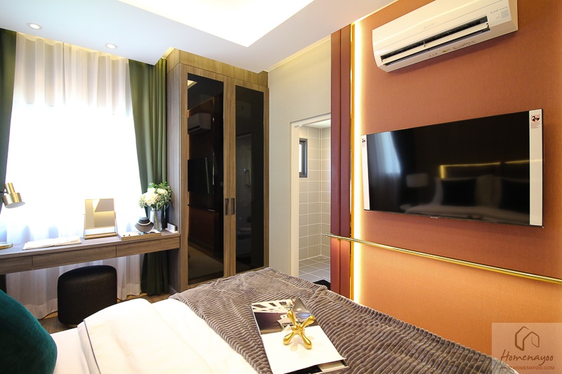 ภายในห้องมีการจัดวางเตียงนอนขนาด 5 ฟุต พร้อมโต๊ะข้าง, Built-in ตู้เสื้อผ้าและโต๊ะเครื่องแป้งขนาดใหญ่ ให้ดูเป็นไอเดีย กำลังเหมาะสมกับพื้นที่ห้องเลย ที่พื้นปูด้วยลามิเนตหนา 8 มม. ให้สัมผัสที่เหมาะกับการพักผ่อนมากขึ้น