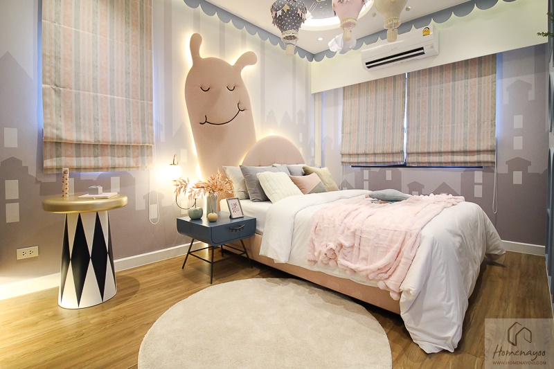 ห้องนอน 3 ตกแต่งออกมาในโทนชมพูน่ารักสำหรับเด็กผู้หญิง แม้จะขนาดเล็กกว่าห้องนอน 2 แต่พื้นที่ภายในห้องก็ยังกว้างขวางอยู่นะคะ วางเตียงนอนขนาด 5-6 ฟุตและเฟอร์นิเจอร์ขนาดใหญ่ได้เหมือนกัน