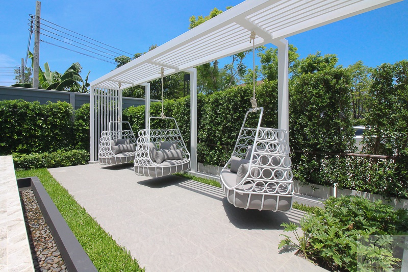 ด้านหน้ามีพื้นที่สวนหย่อมพร้อมม้านั่งชิงช้าสำหรับพักผ่อน