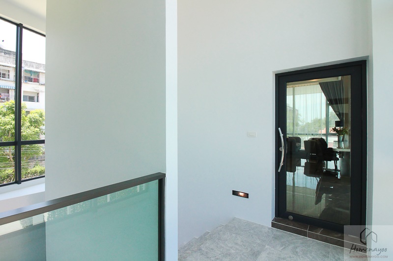 ถัดเข้าไปด้านในเป็นห้องนั่งเล่นชั้นบน เป็นจุดที่สามารถจัดฟังก์ชันได้อย่างอิสระตามไลฟ์สไตล์ของแต่ละครอบครัวเลย บ้านตัวอย่างจัดให้เป็นห้องทำงานและมุมนั่งพักผ่อนติดระเบียงหน้าบ้าน สามารถเปิดออกไปรับอากาศและชมวิวได้