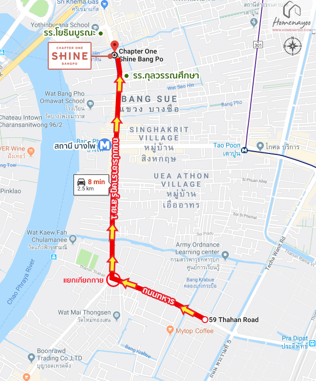 สรุปการเดินทาง ถนนทหาร > แยกเกียกกาย > ถนนประชาราษฎร์ สาย 1 > โครงการ Chapter One Shine บางโพ