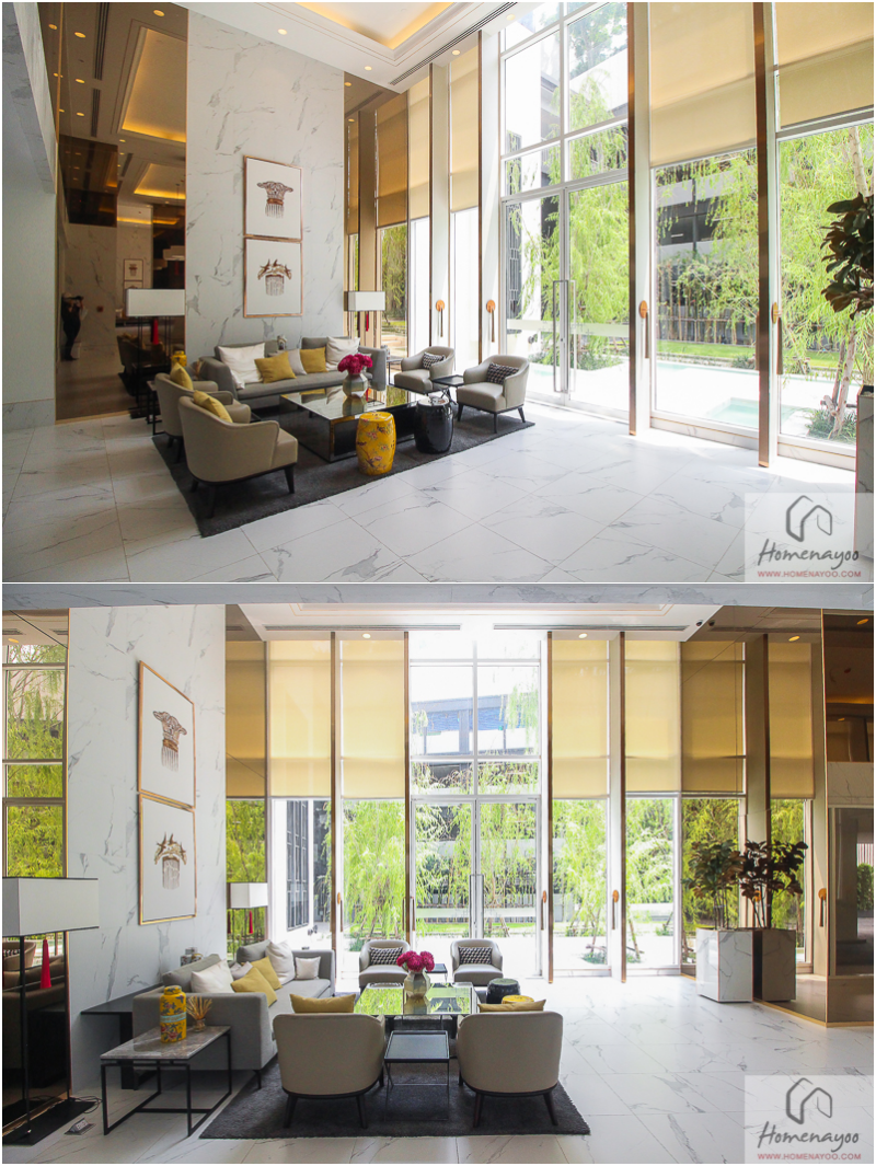 ติดกันจะเป็น Lobby ที่ใช้ผนังเป็นกระจก ทำให้ได้วิวจากสวนด้านนอก ช่วยให้บรรยากาศภายใน Lobby โปร่ง โล่ง สบายตา