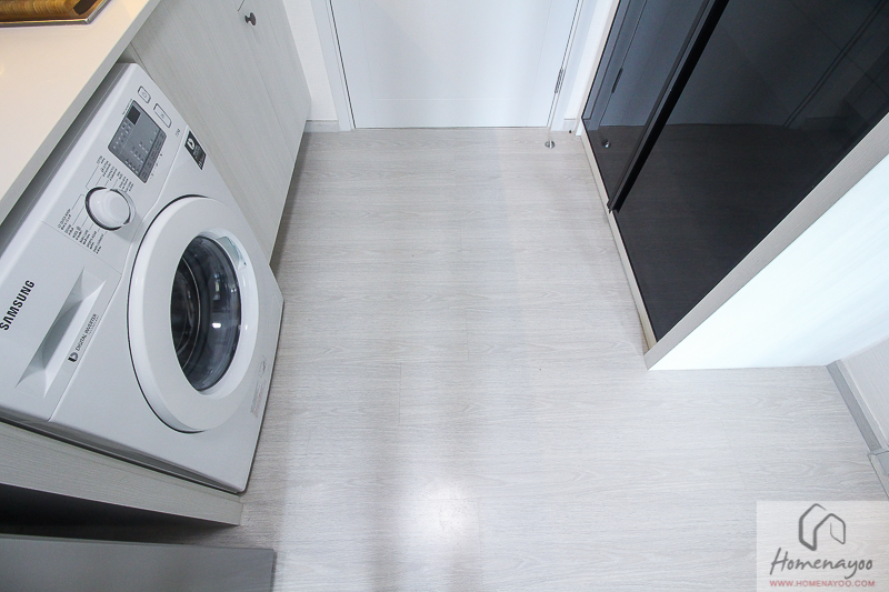 ด้านล่างเคาน์เตอร์แบ่งเป็นตู้และลิ้นชักเก็บของ หน้าบานลามิเนต และเป็นบานปิด Soft Close ทั้งหมด พร้อมช่องสำหรับวางเครื่องซักผ้าฝาหน้า ซึ่งดีมากเลยที่เค้าจัดพื้นที่สำหรับวางเครื่องซักผ้ามาให้ในห้อง ทำให้เรามีพื้นที่เหลือตรงระเบียงไว้วางราวตากผ้าได้แบบสบายๆ