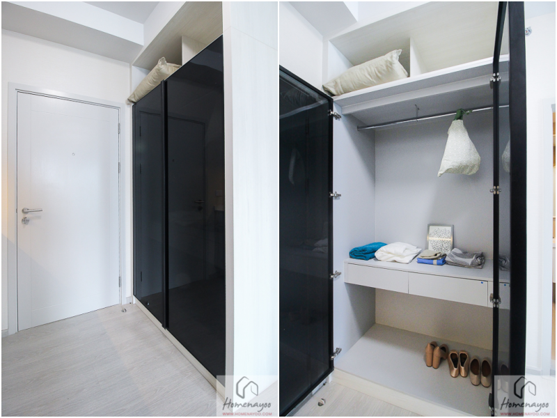 ฝั่งตรงข้ามเคาน์เตอร์ครัวมีตู้เสื้อผ้า Biult – in มาให้ หน้าบานเป็นกระจกใสสีดำ ภายในแบ่งเป็นราวแขวนและชั้นวางของด้านล่างและด้านบน พร้อมลิ้นชัก 2 ช่อง