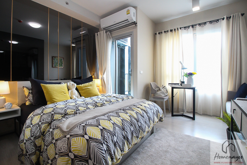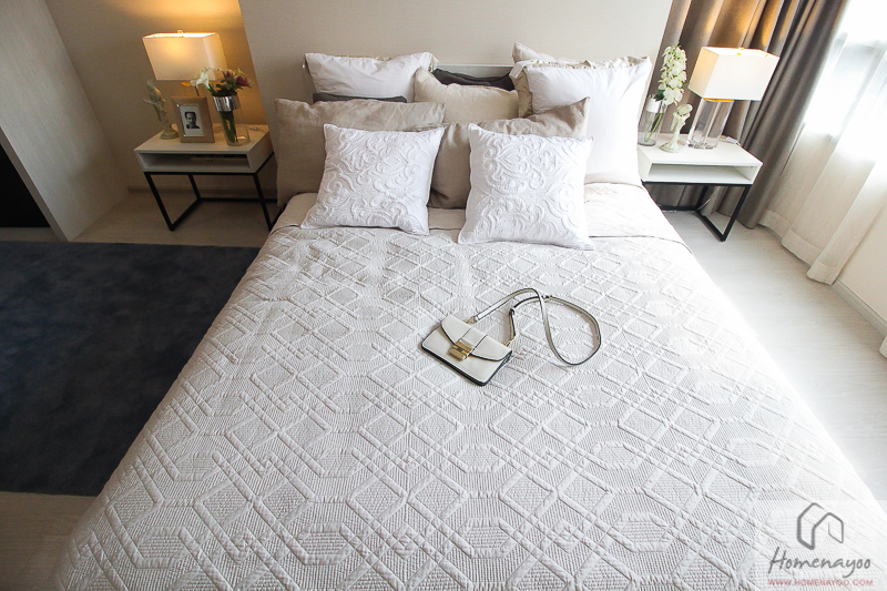 ส่วนพื้นที่ในห้อง สามารถวางเตียงขนาดคิงส์ไซส์ที่ทางโครงการแถมมาให้ได้สบายๆ มีพื้นที่เหลือรอบๆเตียงให้วางโต๊ะหัวเตียงได้ทั้ง 2 ฝั่ง