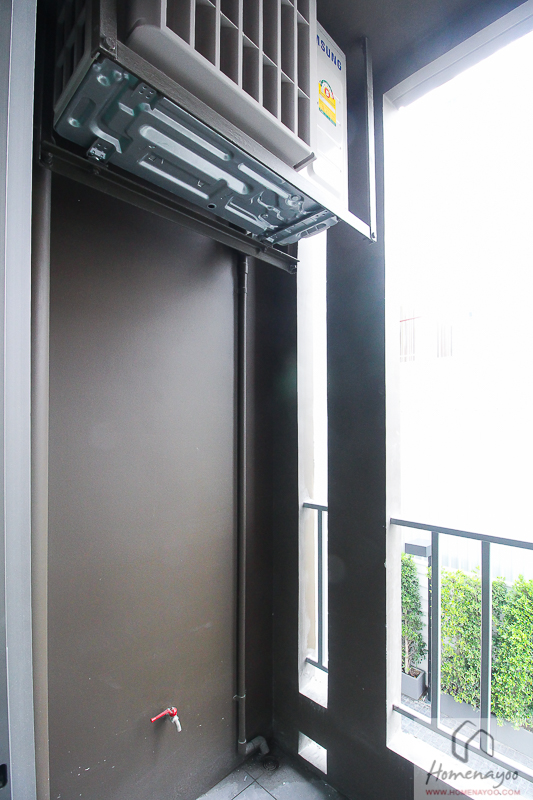 ขนาดระเบียงจะไม่กว้างมาก พอวางราวตากผ้าหรือปลูกไม้กระถางได้ พร้อมติดตั้งก๊อกน้ำมาให้ 1 จุด และดีที่ทางโครงการทำพื้นที่วางเครื่องซักผ้าไว้ในห้องแล้ว ตรงนี้เลยใช้งานฟังก์ชั่นอื่นๆได้เต็มที่