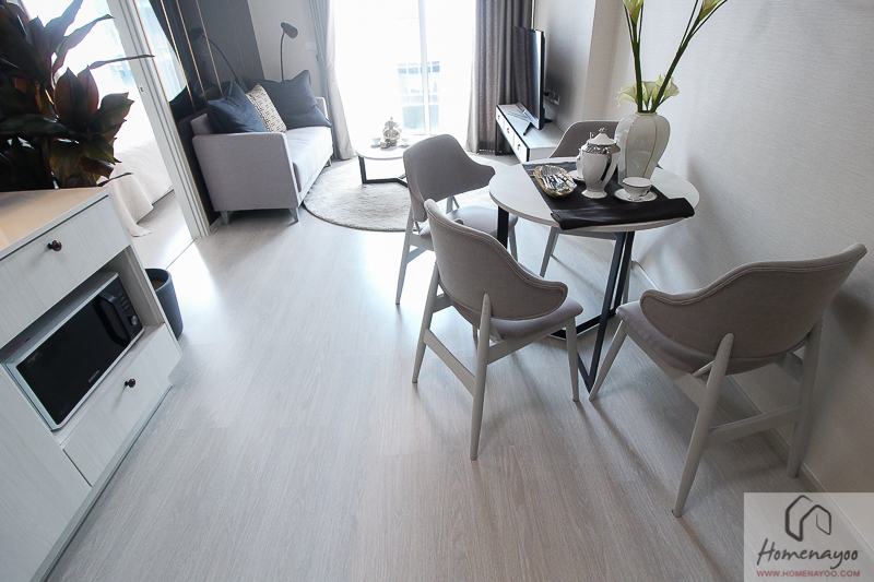 ส่วนพื้นที่ติดกับครัวจัดเป็นพื้นที่ทานอาหาร มีโต๊ะ 4 ที่นั่งมาให้ และมีพื้นที่เหลือรอบๆกว้างพอสมควร