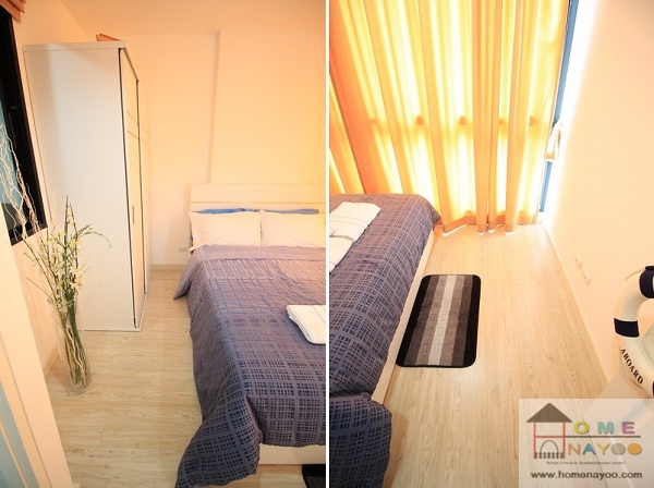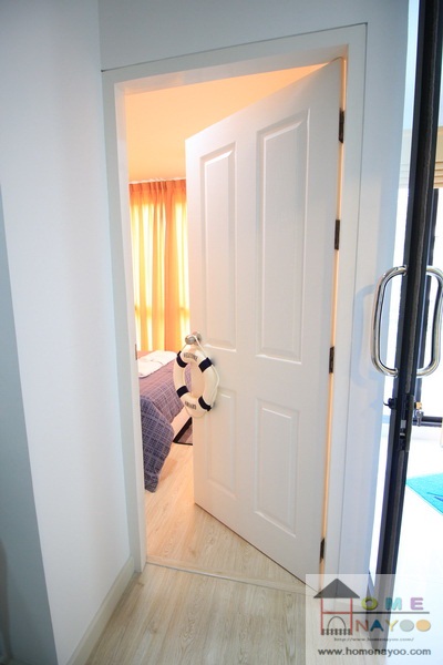 พื้นห้องปูลามิเนตลายไม้ ความหนา 8 มม. เข้ามาภายในห้อง ส่วนแรกคือ Living Area ถัดเข้าไปด้านในเป็นห้องนอน มีหน้าต่างมองออกมาส่วน Living Area ได้ค่ะ