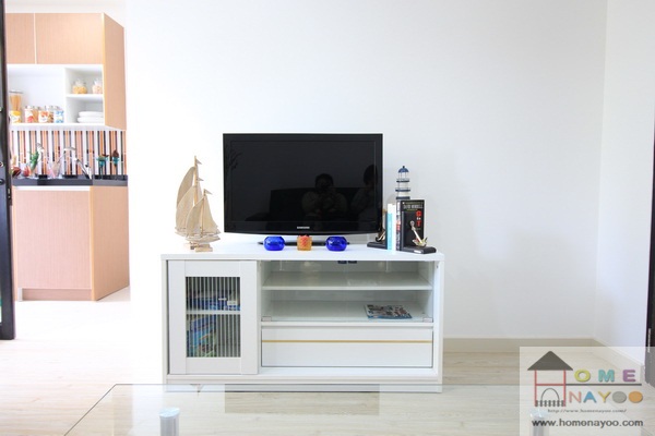 ตรงข้ามกับโซฟา วางตู้วางทีวีสีขาว ขนาด 120×50 ซม. ความสูงของตู้วางทีวี 60 ซม. สามารถวางทีวีได้ใหญ่ถึง 40 นิ้ว เลยนะค่ะ ส่วนด้านข้างชั้นวางทีวี เว้นพื้นที่ว่างให้ประมาณ 80 ซม. สามารถหาชั้นวางของ หรือลิ้นชักใส่ของ มาวางเพิ่มเติมในส่วนนี้ได้ค่ะ