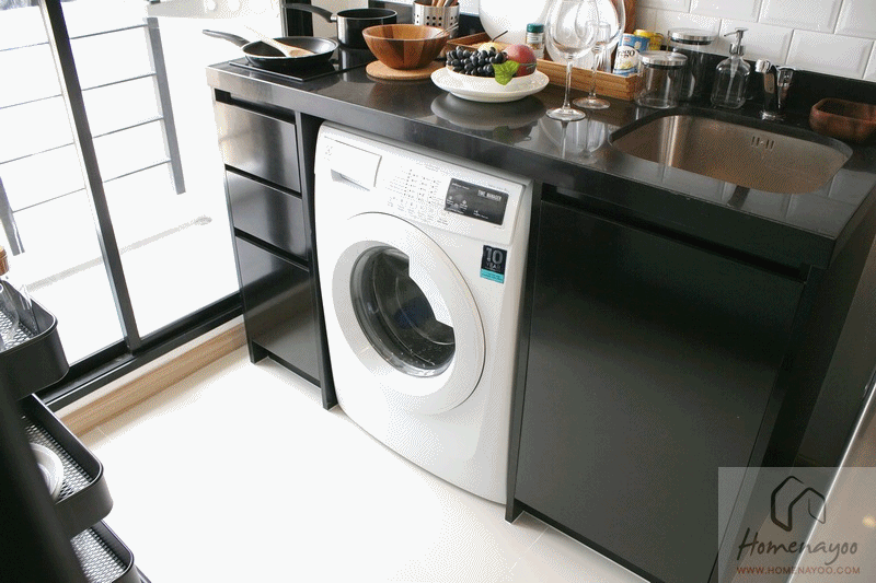 ตู้เก็บของด้านล่าง และ ลิ้นชักเก็บของปิดผิวไฮกรอสสีดำ ตรงกลางเป็นช่องสำหรับวางเครื่องซักผ้าแบบฝาหน้า ด้านหลังเดินงานระบบท่อน้ำดี ท่อน้ำทิ้ง เต้าเสียบปลั๊กไฟให้พร้อมต่อใช้งานได้เลย