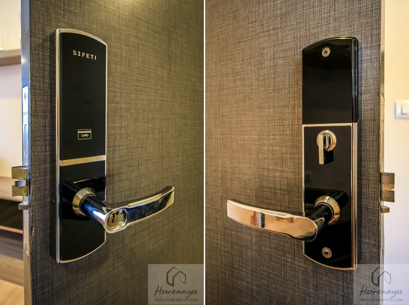 ห้องนอนมีประตูปิดมิดชิดเป็นส่วนตัว ตัวประตูเป็นไม้สำเร็จรูปบานลูกฟักทาสีขาว มือจับประตูแบบก้านโยกฝังล็อก เปิด-ปิดใช้งานได้ง่ายกว่าลูกบิดกลมทั่วไป