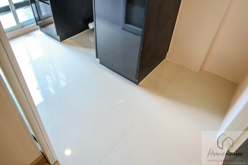 พื้นห้องครัวถูกเปลี่ยนจากลามิเนตมาเป็นพื้นแกรนิตโต้สีครีม 60 x 60 ซม. ซึ่งเหมาะแก่การใช้งานหนัก ทนน้ำ ทนความชื้นได้ดี เช็ดล้างทำความสะอาดได้ง่าย
