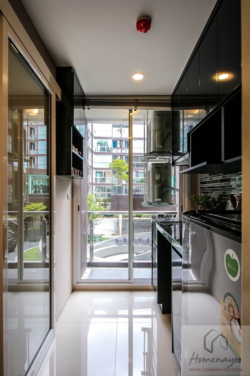 ห้องครัวได้ฟังก์ชั่นครัวปิด แยกส่วนด้วยประตูกระจกบานเลื่อน กรอบอลูมิเนียมสีขาว ความกว้าง 80 ซม. โดยประตูครัวจะใช้เป็นแบบรางแขวน ทำให้ไม่มีรอยต่อที่พื้น เดินเข้า-ออกได้สะดวก และยังช่วยให้กวาดพื้น ถูพื้นได้ง่าย