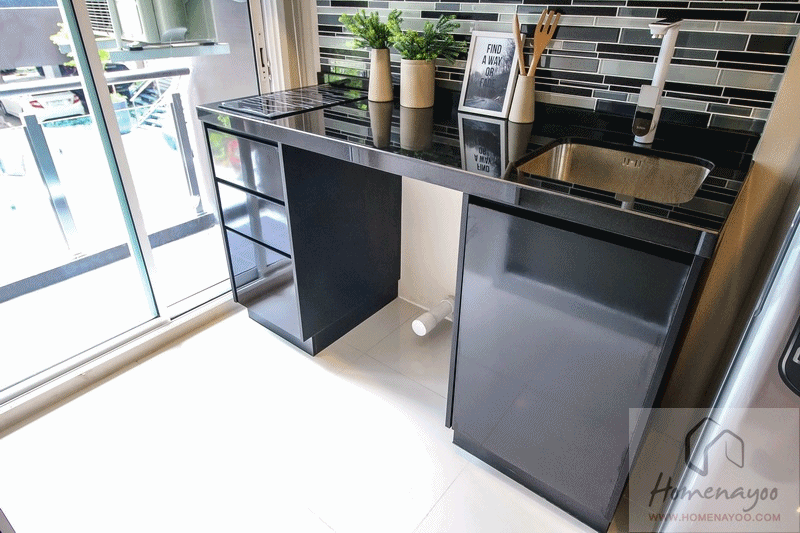 ใต้เคาน์เตอร์ครัวมีตู้เก็บของบานเปิด 1 ช่อง, ลิ้นชักเก็บของ 3 ช่อง และ ช่องสำหรับวางเครื่องซักผ้าฝาหน้า ขนาดไม่เกิน 7 กก. ด้านหลังเดินงานระบบประปา ท่อน้ำดี-ท่อน้ำทิ้ง พร้อมเต้าเสียบปลั๊กไฟให้เรียบร้อย
