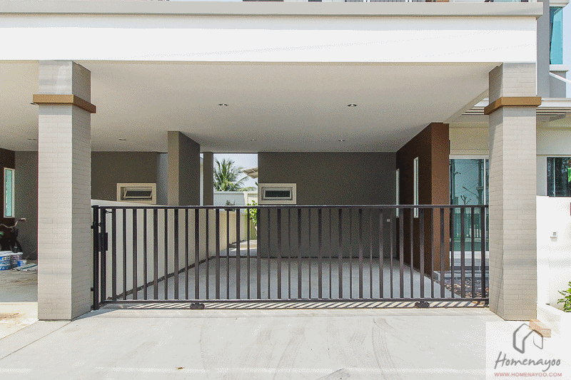 สำหรับหน้าบ้านมาตรฐานจะได้รั้วเหล็กรางเลื่อนสีดำ ระบบไฟฟ้า ควบคุมด้วยรีโมต เปิดได้เต็มหน้ากว้างบ้าน