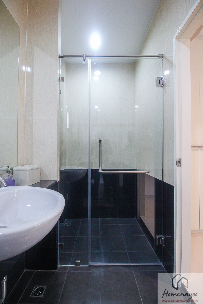 ส่วนโซนห้องอาบน้ำจะมีฉากกั้นอาบน้ำ กระจกนิรภัย ประตูบานผลัก ติดตั้งมาให้ทุกห้อง