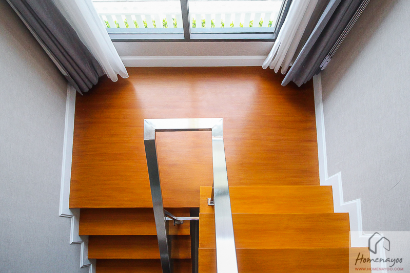บันไดใช้เป็นโครงสร้างคอนกรีตเสริมเหล็ก ปิดผิวลูกนอนด้วยไม้ Conwood ราวจับสแตนเลส และกระจกนิรภัย ติดตั้งมาให้ตั้งแต่ขั้นแรกเลย