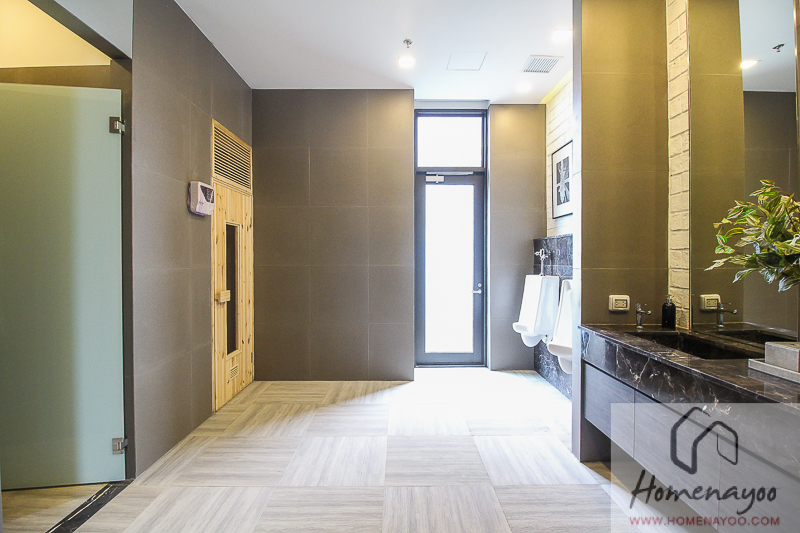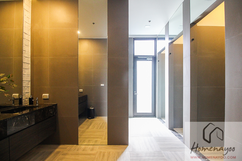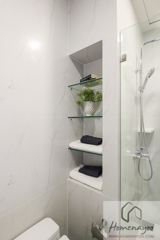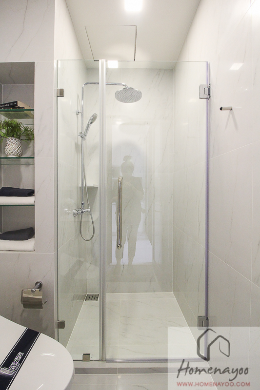 สำหรับพื้นที่ส่วนห้องอาบน้ำจะมี Shower Box กระจกนิรภัยติดตั้งมาให้ บานเปิดเป็นบานผลัก