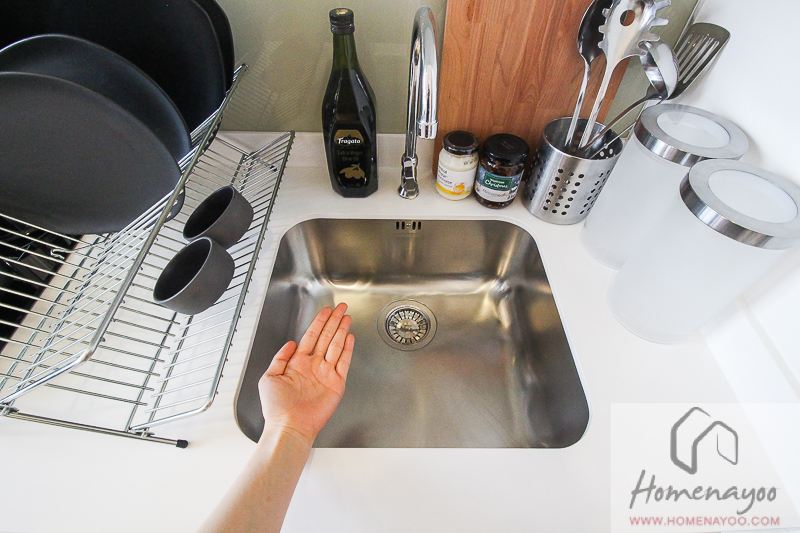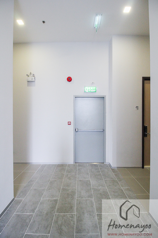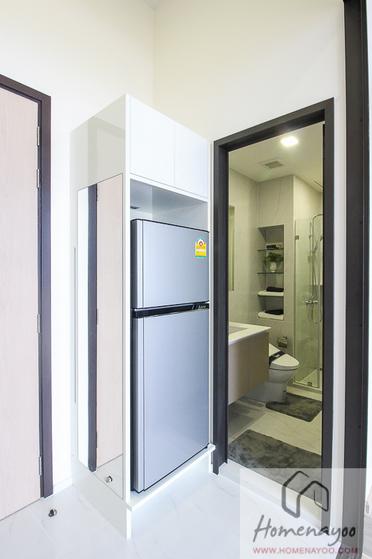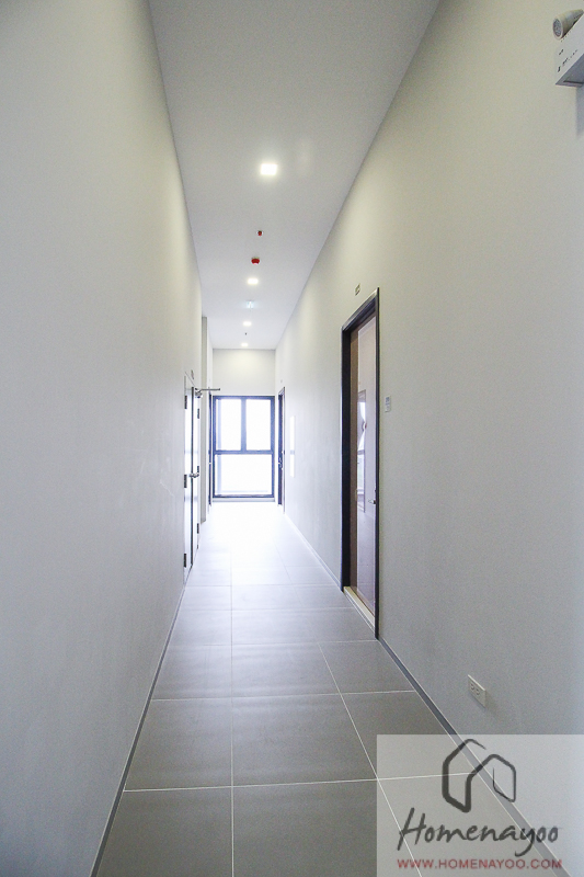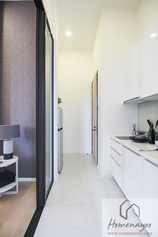 ออกมาจากห้องน้ำมองย้อนไปทางเข้าห้องจะเห็นโถงทางเดินยาวและส่วนครัวแบบนี้ค่ะ